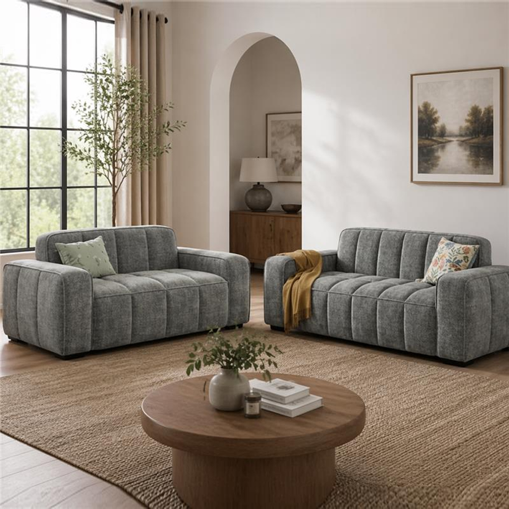 Upgrade your living room with the sleek sophistication of the Furniture in Fashion Pelaro Fabric 3+2 Seater Sofa in Grey. Designed for modern homes, this elegant sofa set includes a spacious 3-seater and a matching 2-seater, offering ample seating for family and guests. The versatile grey fabric adds a contemporary touch, making it easy to coordinate with a wide range of interior stylesfrom minimalist to classic decor. Built for both comfort and durability, the Pelaro sofa set features a sturdy wooden frame and high-quality fabric upholstery. The generously padded foam cushions provide excellent support for everyday relaxation, while the ergonomic design ensures long-lasting comfort. Grey fabric sofas are highly popular for their practicality, as they maintain a clean, modern look while being easy to style and maintain in busy households. The Furniture in Fashion Pelaro Fabric 3+2 Seater Sofa in Grey offers the perfect combination of style, comfort, and practicality. Ideal for modern living spaces, it provides a spacious and elegant seating solution for everyday use and entertaining. FEATURES: Material: Fabric, Polyester Finish: Grey Set Include: 1 x 2 Seater Sofa, 1 x 3 Seater Sofa Upholstered in soft grey fabric for a modern and versatile appearance Strong and durable solid wood frame construction for long-term use Comfortable foam-filled seat cushions provide excellent support Spacious seating ideal for family living and entertaining guests Neutral grey tone complements modern, contemporary, and classic interiors Ergonomic design with supportive backrests and comfortable armrests Sturdy legs ensure stability and durability Easy to maintain suitable for regular cleaning and everyday use Perfect for living rooms, lounges, and office reception areas Available at an affordable price Images shown are for Illustrative Purposes only 2 SEATER DIMENSIONS: Height: 79cm Width: 177cm Depth: 87cm Seat Height: 48cm 3 SEATER DIMENSIONS: