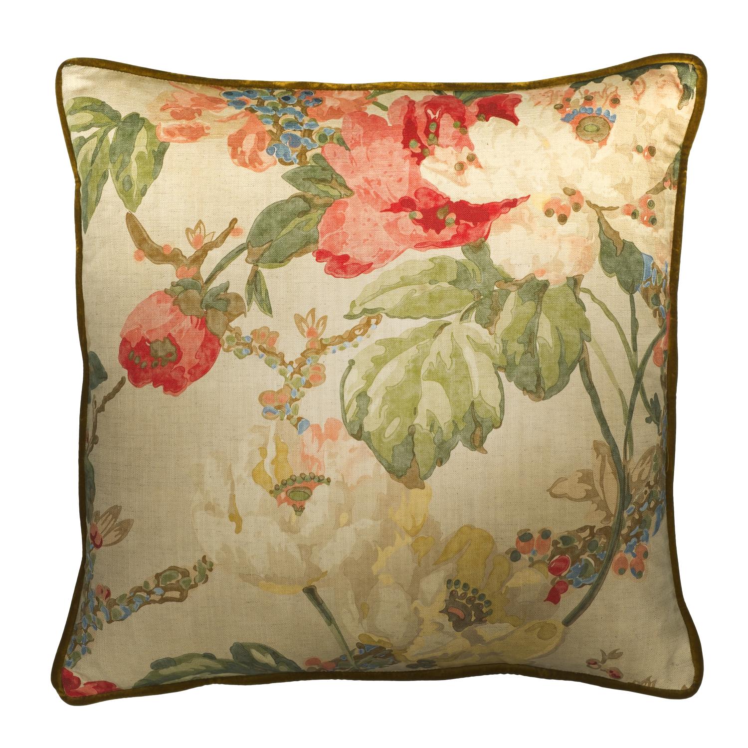 A luxurious cushion made from Peony Natural, a traditional print of English flowering peonies with lush leaves and stems on a natural background, finished in soft Medici Olive piping. Peony Natural, Sustainable Feather, Cushion - Andrew Martin Eco-conscious & Cotton & Cotton Blend & Linen & Linen Blend Floral