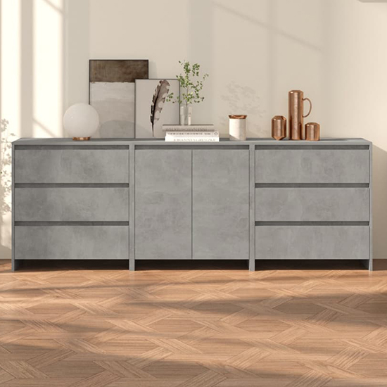 Pepa Wooden Sideboard With 2 Doors 6 Drawers In Concrete Effect, These sideboards make a perfect decorative as well as practical addition to your existing decor. FEATURES : Material : Engineered wood Finish : Concrete Effect Set Includes : 1 x Sideboard with Doors, 2 x Sideboard with Drawers These side cabinets provide ample storage space for keeping your daily essentials organised and within reach The sturdy top is perfect for displaying decorative objects, photo frames, and potted plants Additionally, these storage cabinets are easy to clean with a damp cloth Manual assembly is required Available at an affordable price Images shown are for illustration purpose only SIDEBOARD WITH DOORS DIMENSIONS : Height : 73. 5cm Width : 70cm Depth : 40cm SIDEBOARD WITH DRAWERS DIMENSIONS : Height : 75cm Width : 70cm Depth : 41cm