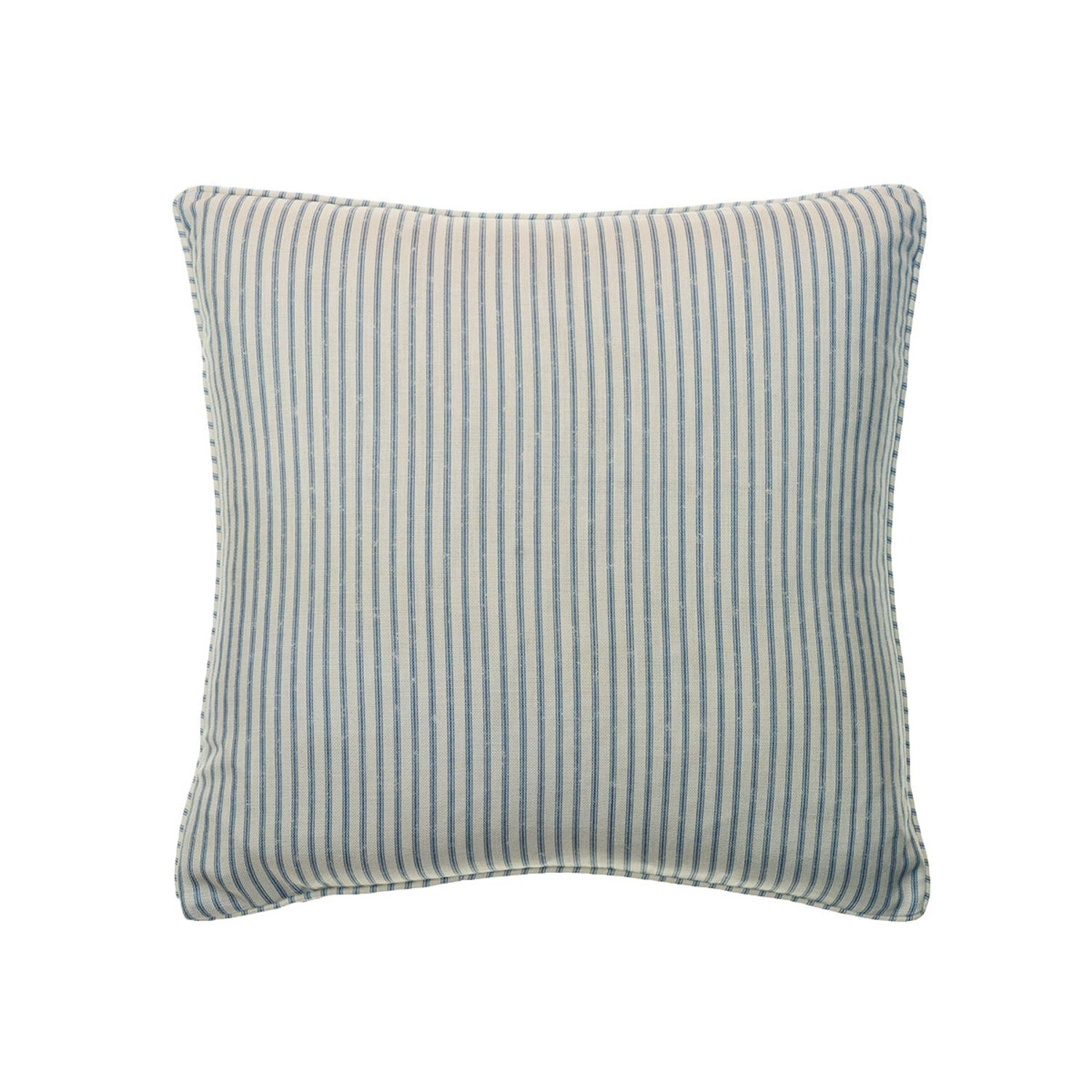 Blue ticking stripe feather cushion A soft and plump square cushion created from our Picket Denim fabric, a classic ticking stripe. Finished with neat self-piping, this cushion has been designed to be styled alongside the other small-scale prints and similar colours of the Garden Path collection, a homage to the English Garden. The fabric used in this design is printed on the edge of the Lake District using ECOFAST technology, a digital pigment printing method which uses 50% less water than traditional techniques.