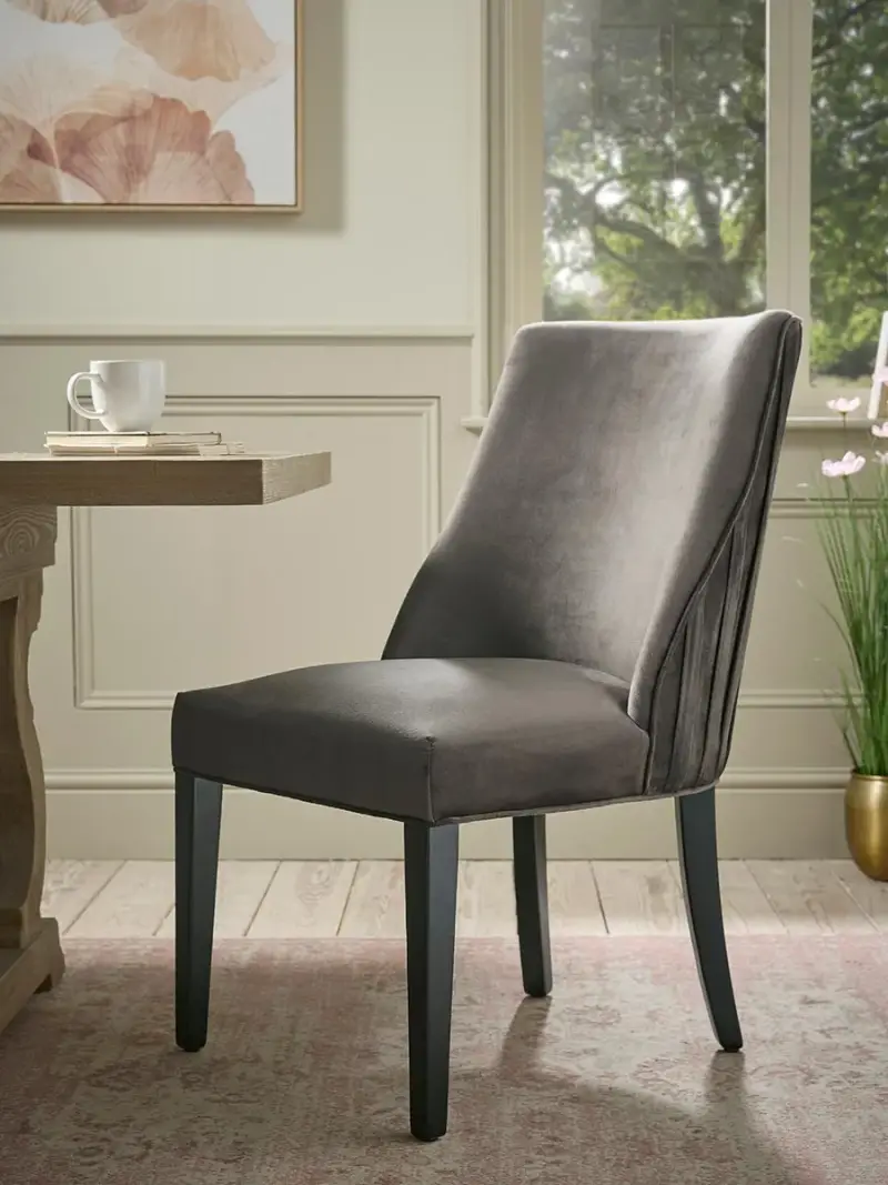 Bring refined softness to your dining space with our Pleated Velvet Dining Chair. Upholstered in smooth, sumptuous velvet, it offers a comfortable, gently curved seat that feels both supportive and indulgent. The pleated detailing along the back adds elegant texture, giving the chair a sophisticated, tailored look.Set on sleek, dark wooden legs for subtle contrast, it works beautifully in both contemporary and classic interiors. A stylish and inviting piece that elevates every mealtime with a touch of quiet luxury.