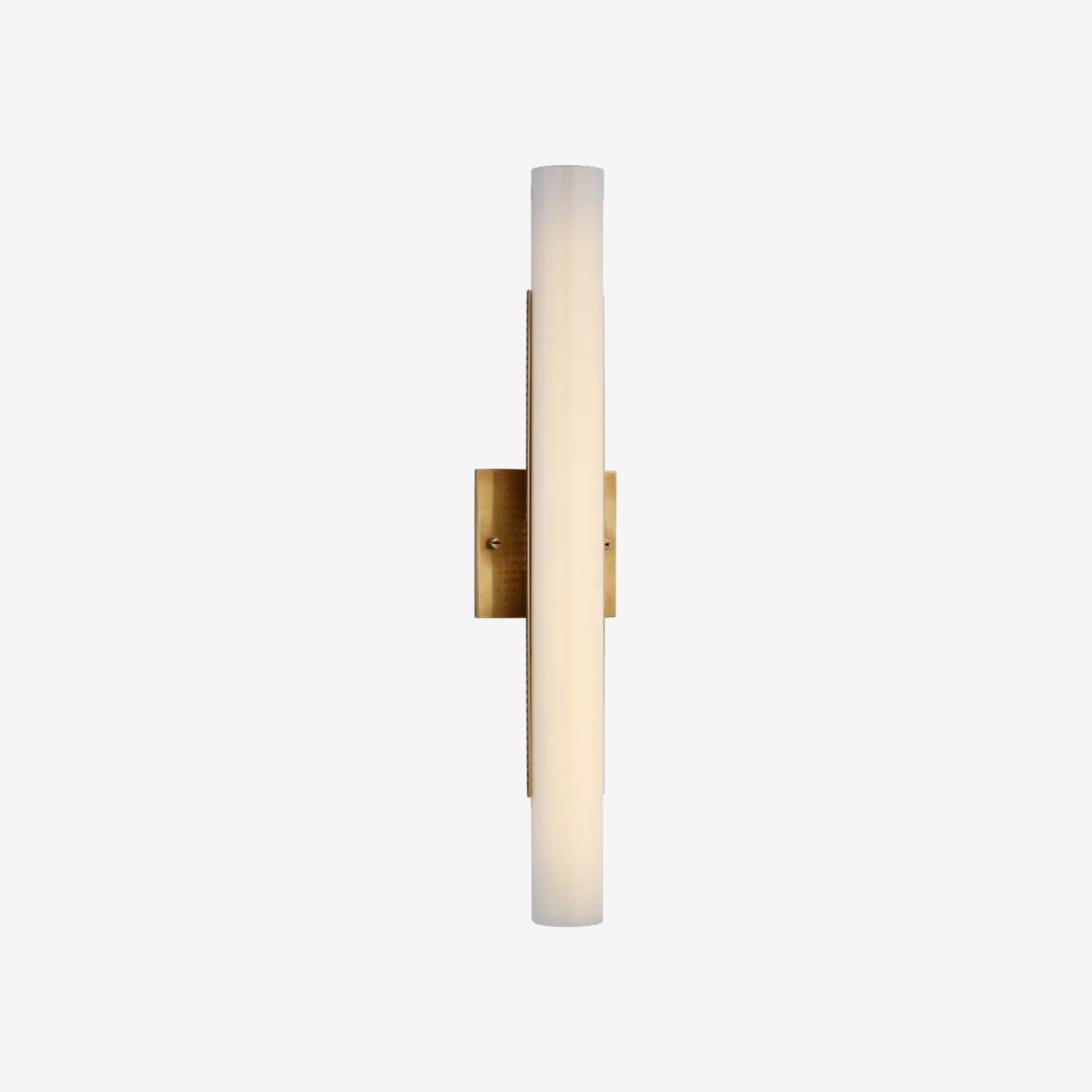 A contemporary wall light with a cylindrical white glass form and an antique burnished brass fixing. Crafted by iconic designer Kelly Wearstler, Precision exudes unique style and luxury living. It suits bathroom décor, best in multiples. Precision Large Wall Light Brass, Light, Large, Antique-Burnished Brass - Andrew Martin