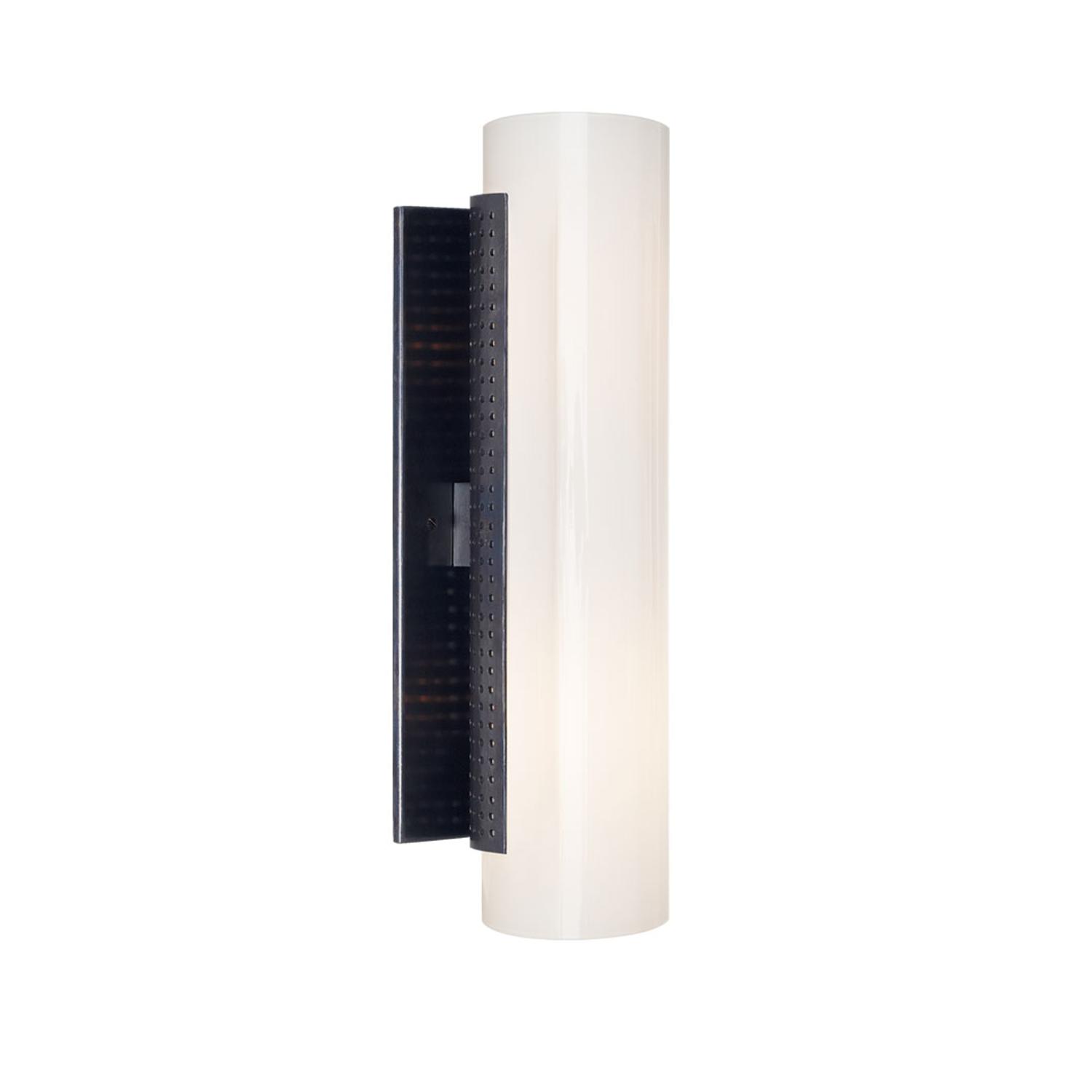 Contemporary wall light with a cylindrical white glass form and a bronze fixing. Crafted by iconic designer Kelly Wearstler, to suit bathroom decor. Precision Wall Light Bronze, Wall Light, Small - Andrew Martin