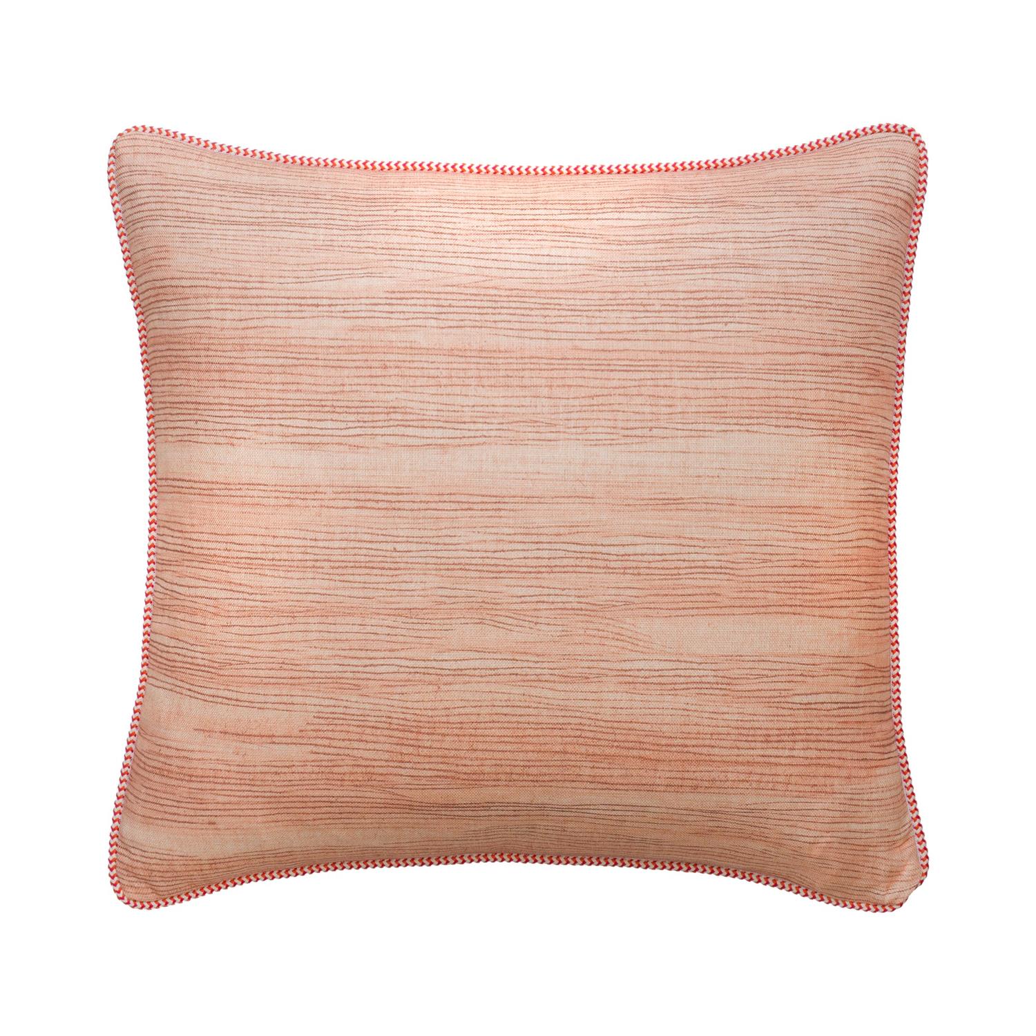 Grounded and confident, Puff Rust combines earthy red tones with hand-drawn brush marks, offering a cushion that feels both rustic and refined. Puff Rust, Sustainable Feather, Cushion - Andrew Martin Kit Kemp Linen & Linen Blend Stripe