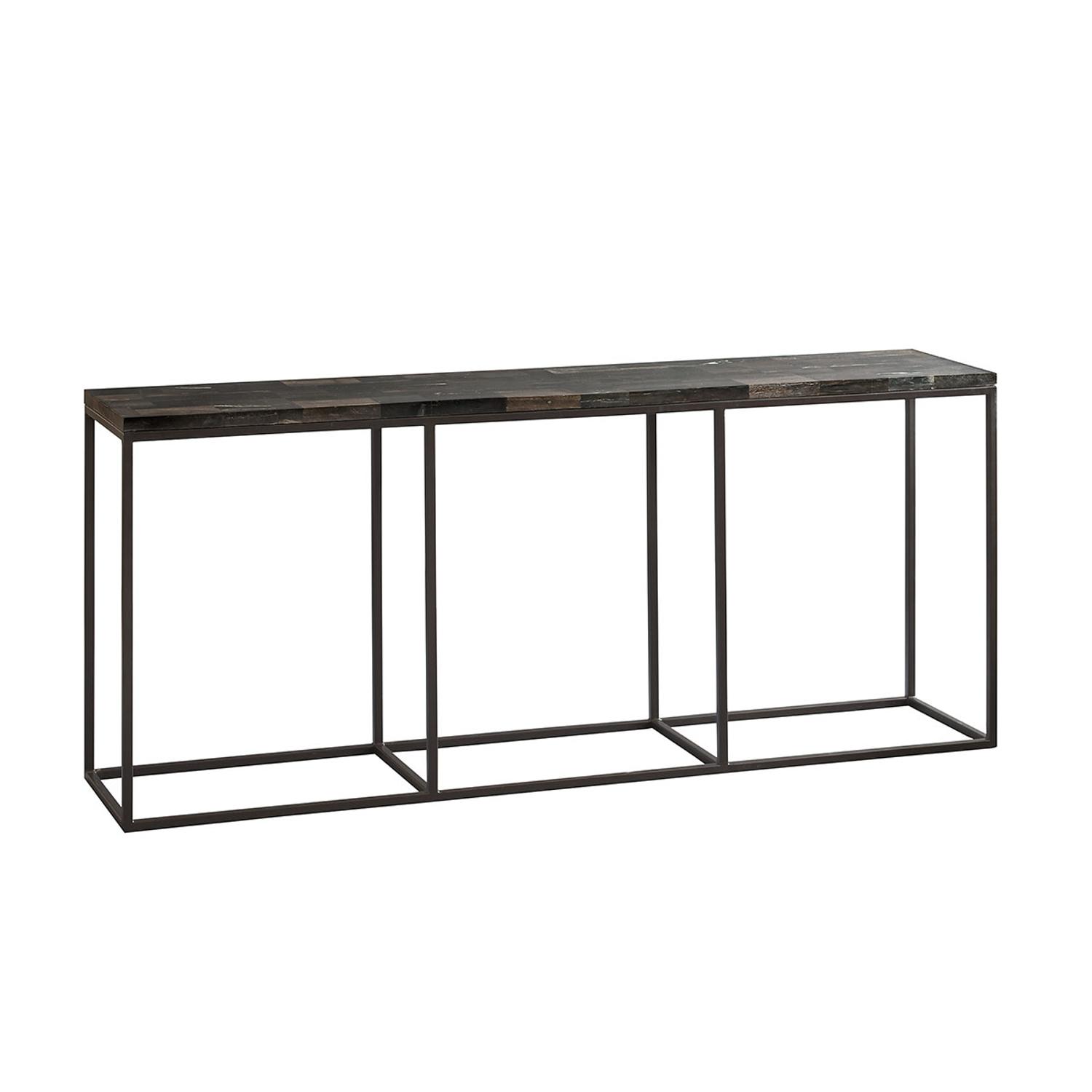 This slim, modern console is perfect for styling up hallways and reception rooms. Raife has a minimalist dark metal frame with a dark top made from petrified wood. Due to the organic nature of the petrified wood material each piece will vary in appearance making it completely unique. Raife Console Table, Console Table - Andrew Martin