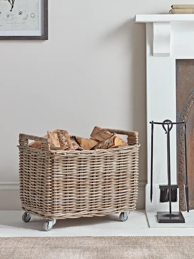 Take the heavy lifting out of keeping the home fires burning with this impressive log basket on wheels. This large basket is woven from sturdy wicker in lovely silver grey tones. There are two handles with which to pull or push the basket, which is set on four sturdy wheels for full manoeuvrability. A great addition to the fireside, that is practical as well as stylish.