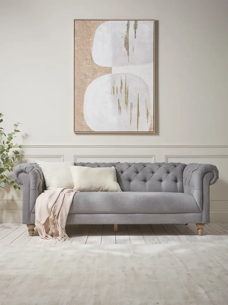 Elegant in style and stature, our Raya sofa is traditional in shape making it perfect for more traditional interiors. The button backed grey upholstery and delicately carved legs create a classic sofa for you to recline on after a long day.