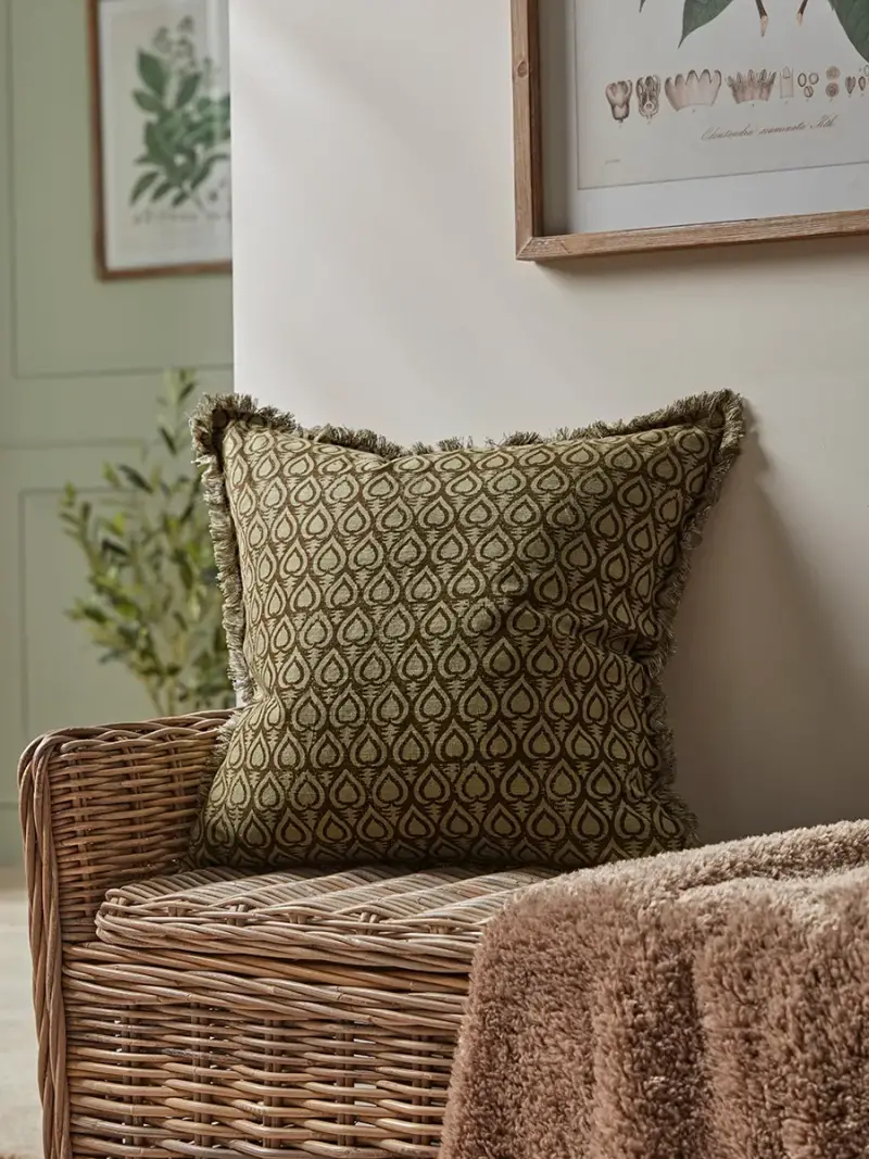 Our Rayas Cushion with its unfinished border provides a wonderful raw energy that sits well in homes where rustic or industrial styling is celebrated.On a base of warming earthy tones, a repeated teardrop pattern cascades over the cover in a light shade to create a cushion that is perfect for a touch of individuality in a neutral inspired home.Fine stitching creates a border in a cotton blend fabric for a cushion that is sumptuously soft and cosy enough for you to sink into.
