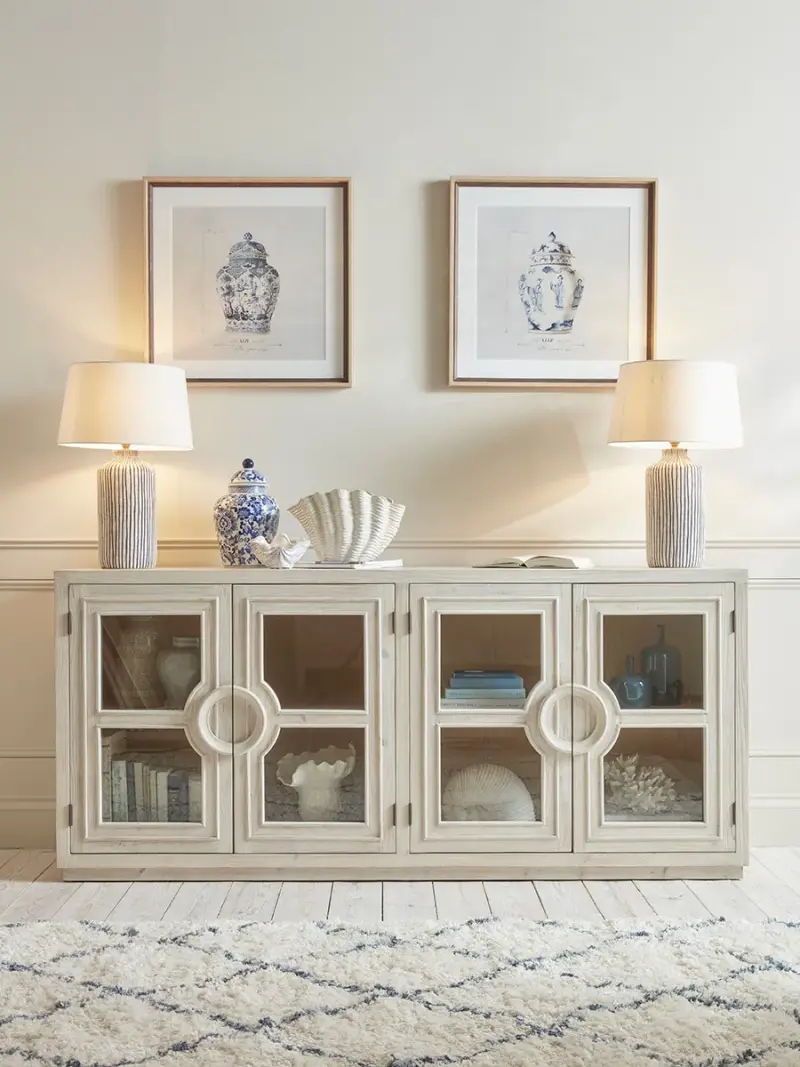Unusual round moulded door handles are first to draw the eye to this elegant wooden sideboard.Crafted from recycled pine, the wood has an almost bleached tone which softens its formality and gives a fresh country feel.Glazed doors create a sense of lightness and allow you to display favourite collections of books or china and adjustable shelves make it a versatile piece for living or dining room.