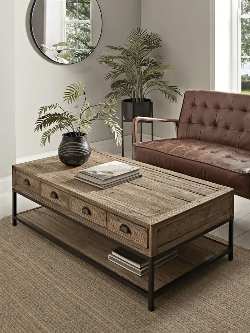 Crafted from reclaimed Oak, our sturdy coffee table has a smooth, rustic finished top and visible wood grain details.With two drawers, an open shelf and aged metal handles, it is practical and stylish.