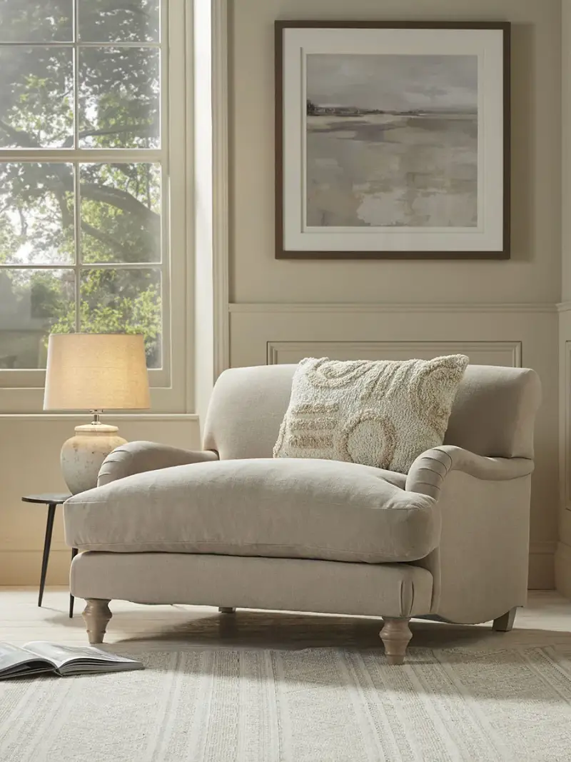 This restful silhouette showcases handcrafted details such as hand folded pleats and polished turned hardwood legsThe Reine Loveseat features all the beauty of the armchair with that bit of extra space to fully luxuriate alone or cuddle up with someone precious. The seat has a deep feather and foam filled base making it a joy to sink into and the legs are in a limewashed oak finish. Your loveseat will be upholstered by hand, especially for youThe range also includes two and three seater sofas, an ottoman and an armchairPictured here in our Taupe Cotton Linen our Reine collection can be upholstered in a choice of 34 distinctive shades and six fabrics to suit your style Read our Upholstery FAQsView our full Upholstery Terms and Conditions