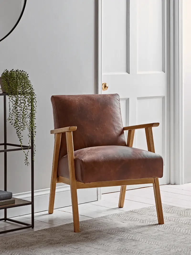 A considered chair, comfortable and elegant. Inspired by mid-century principles of clean lines and gentle curves, our chair features a simple ash wood frame, a subtle recline and a sumptuous real leather seat. A wonderful spot to lounge. Also available in natural linen.