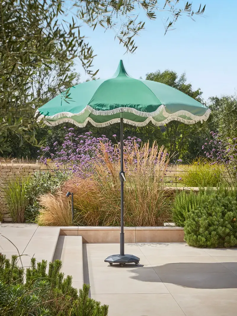A delicate tassel trim sits gracefully along the edge of this gently scalloped Retro Parasol. With a circus tent style, the green block colours alternate between a dark and light tone, creating a vibrant scene and a wonderful array of different greenery to add to your garden. With a black pole, a touch of modernity is added to a colourful and fun retro style parasol, brightening up any outdoor dining or sunlounger set up. It should always be teamed with a sturdy base, such as our Geometric Parasol Base (available separately).
