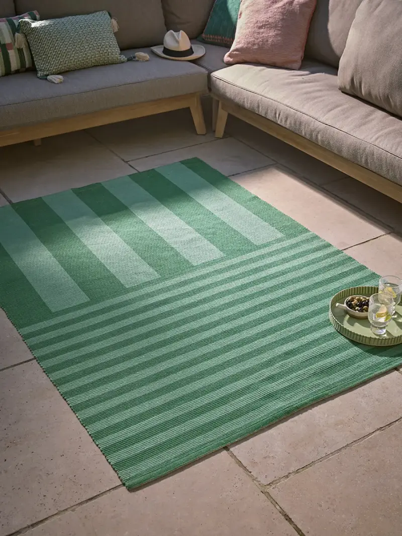 With fresh tones that bring a modern versatility, our Retro Stripe Indoor Outdoor Rug brings effortless style and comfort to your outdoor space.Woven in a bold yet balanced striped design, the tonal green hues create a calm, contemporary look that pairs perfectly with natural wood, rattan, or stone.Made with durable flatweave material that combines lightweight functionality with long-lasting strength, this rug is designed to withstand sun, rain, and daily use while maintaining its vibrant appearance. The smooth, practical texture feels soft underfoot and is easy to clean, making it ideal for patios, terraces, and garden rooms. And, when the weather turns, it is just as fitting for indoor spaces.