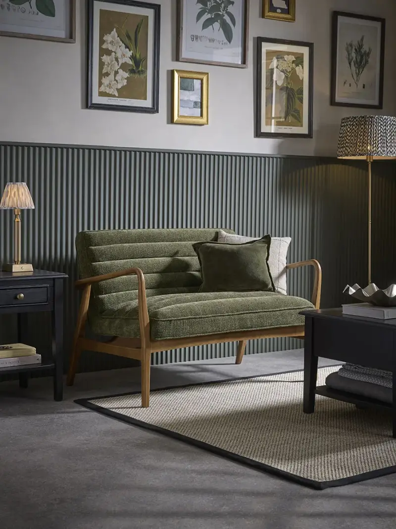 Soft, curvaceous lines work with the warming oak to create a modern silhouette in this mid-century sofa.With a foam-filled seat pad that is covered in a ribbed, deep green polyester, it provides plenty of comfort and style to a living space that embraces contemporary living.