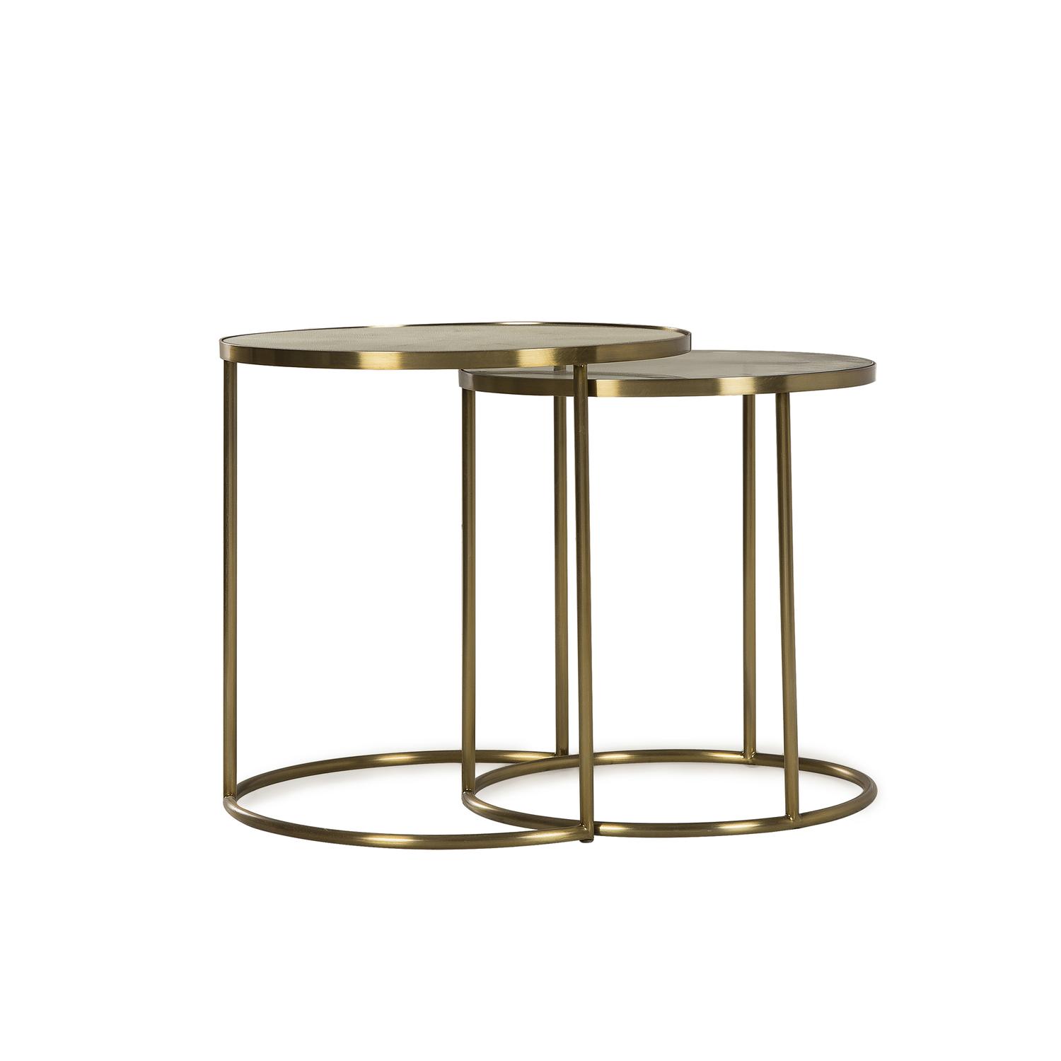 An opulent pair of nesting side tables with beautiful satin brass frames. One with a pearlized shagreen top and the other with clear glass. Compliment a contemporary luxe design scheme with this eye-catching piece. Ringo Side Table, Nesting Side Tables - Andrew Martin