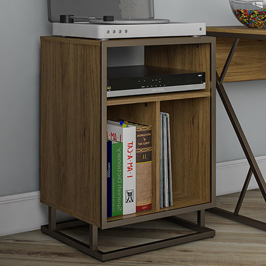 Introducing the Furniture in Fashion - Rockingham Wooden Turntable Bookcase in Walnut, a perfect fusion of functionality and style for your home. This bookcase features a captivating Walnut colour that adds a touch of vibrancy to any room. Crafted with meticulous attention to detail, the sturdy wooden construction ensures durability and longevity. The bookcase not only provides ample storage space for your books and decor items but also includes a built-in turntable platform, allowing you to enjoy your favourite vinyl records in a convenient and stylish manner. With its compact design and multiple shelves, it is perfect for small spaces or as a statement piece in any room. The Rockingham Wooden Turntable Bookcase combines practicality, organization, and a retro aesthetic, making it a must-have for music enthusiasts and book lovers alike. Elevate your space with this Furniture in Fashion creation and indulge in its perfect combination of storage and entertainment. FEATURES : Material : MDF, Metal Finish : Walnut Add a multifunctional piece to your living room or den with the Rockingham Turntable Stand Made of laminated particleboard with a sturdy metal base for a fun and contemporary look The 3 open cubbies are ideal for organizing all of your favourite albums The top cubby features an open back to easily connect audio equipment Available at an affordable price Images shown are for illustration purpose only DIMENSIONS : Height : 700mm Width : 482. 60mm Depth : 410mm