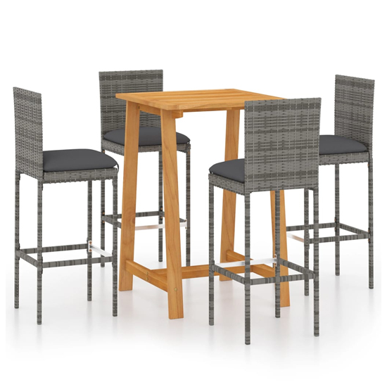 This garden bar set has an elegant design and is the focal point of your garden, patio or terrace. FEATURES : Table Material : Solid acacia wood with an oil finish Table Finish : Natural Chair Material : PE rattan, steel Chair Finish : Grey The table is made of solid acacia wood with an oil finish, which makes it stable, durable and easy to maintain Featuring a powder-coated steel frame covered with weather-resistant PE rattan, the bar stool is sturdy and easy to clean The thick, removable seat cushions are highly comfortable The cushion covers with zippers can be easily removed and washed In order to extend the life of your outdoor furniture, we recommend you to clean it regularly and do not leave it outdoors without protection unnecessarily Use a mild soap solution If possible, store in a cool, dry place indoors If the product is stored outdoors, protect it with a waterproof cover Wipe and dry the excess water or snow from flat surfaces after a rain or snowfall Allow sufficient air circulation to avoid moisture-related damage Assembly required : yes Available at an affordable price Images shown are for illustration purpose only TABLE DIMENSIONS : Height : 104cm Width : 70cm Depth : 70cm CHAIR DIMENSIONS : Height : 108cm Width : 40cm Depth : 44cm