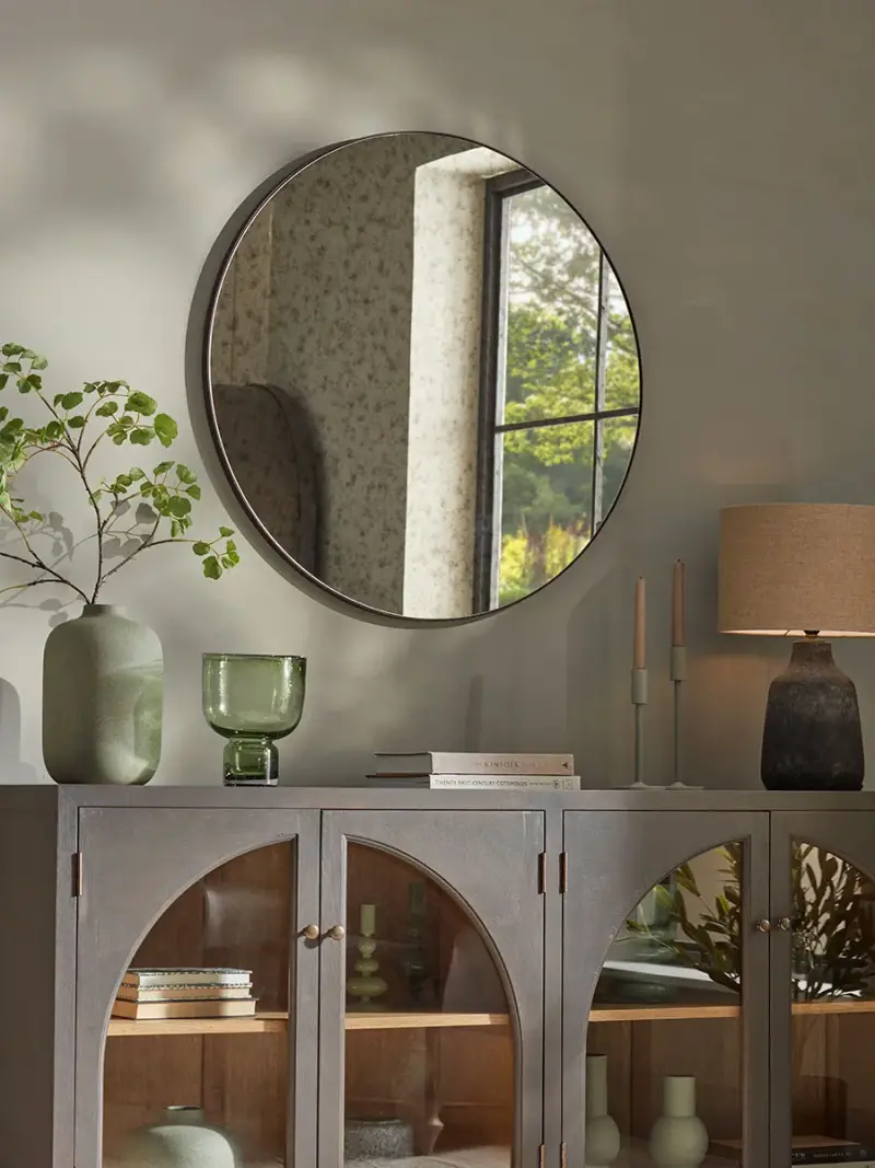 With a dark frame made from iron, this simple round mirror is full of rustic charm. The hard wearing frame paired with the antique style glass creates a look perfectly suited to contemporary and industrial style homes.Place above a sideboard or in you hallway to create the illusion of greater space and light in your home.