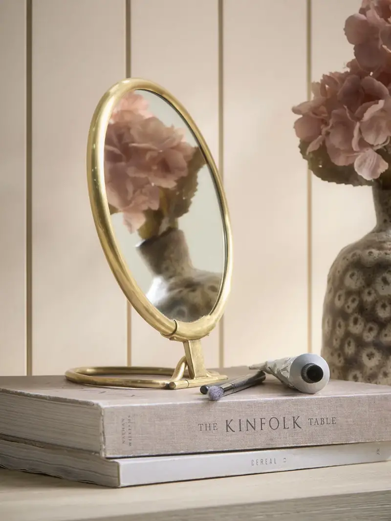 With its softly rounded silhouette and warm brass-toned frame, this elegant tabletop mirror brings a refined touch to any home. Set on a tubular metal base, the design feels both contemporary and timeless, making it a beautiful addition to a bathroom, dressing table or chest of drawers. Available in two sizes, the mirror is perfectly proportioned for daily rituals, whether used for getting ready in the morning or as a decorative accent layered among candles and accessories. The brass coloured metal frame adds a subtle glow, catching the light and complementing both modern and classic interiors.