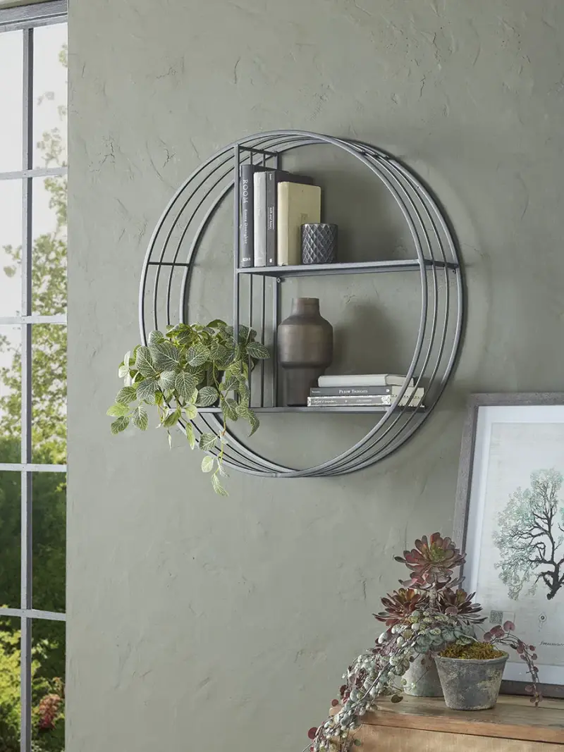 Art Deco styling with an industrial spirit is the hallmark of this shelf unit. Bands of black metal make up the round frame, which is dissected by two shelves, making it an unusual arena in which to display a favourite collection or a set of books. Try accenting with botanicals - the contrast will work to highlight the feature metal framework.