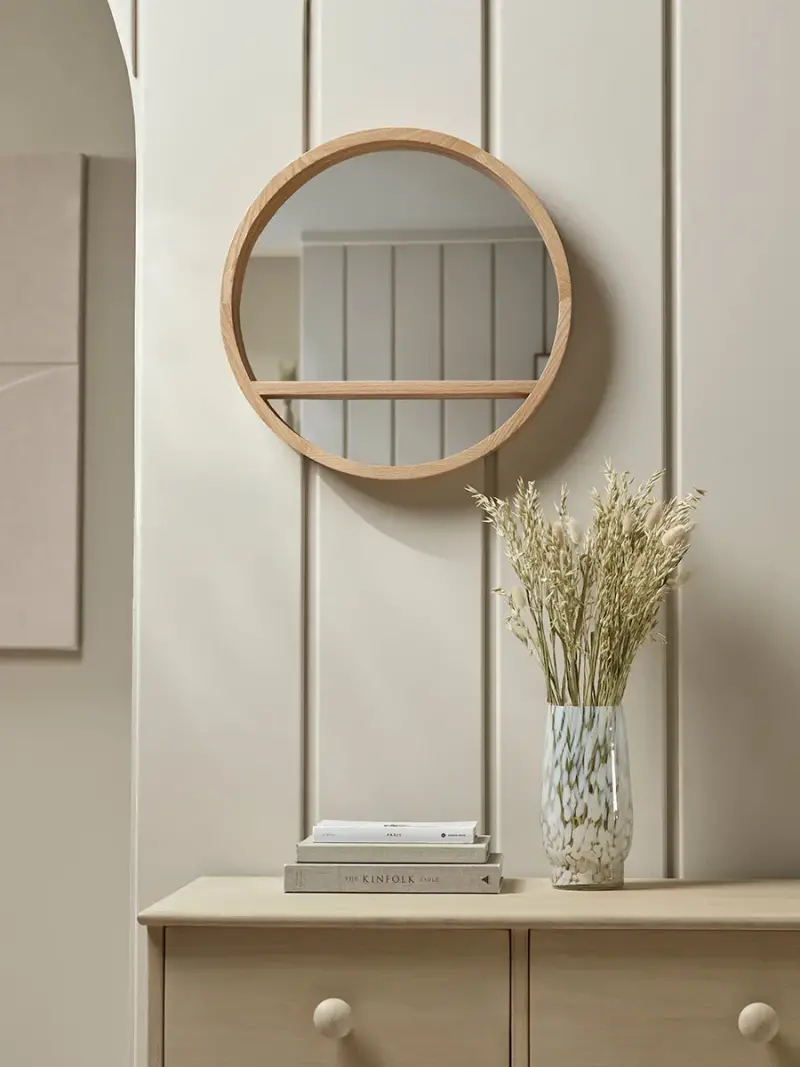 With all the simplicity of Scandi-inspired design, this circular mirror crafted from blonde oak, is dainty in size and perfect for placing in your bathroom or above a dressing table.The petite shelf sits across the lower half of the glass for a modern take on a traditional design.