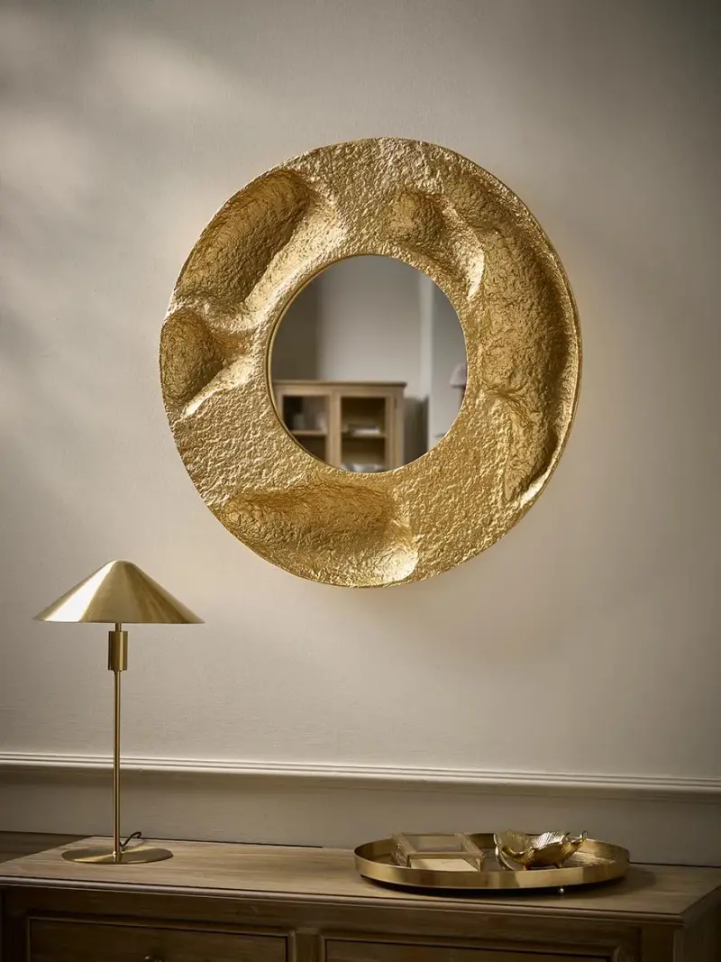 Echoing the beauty of sculptural form, our Round Textured Brass Mirror brings artful depth and radiance to your wall. Crafted with a molten-style surface in warm, lustrous brass-toned aluminium, it captures and reflects the light in a way that feels both luxurious and organic.Its striking circular frame creates a sense of movement and dimension, making it as much a statement piece as a functional mirror. Perfect above a console, in a hallway, or as a dramatic focal point in your living space, it introduces a subtle opulence that feels timeless yet contemporary.