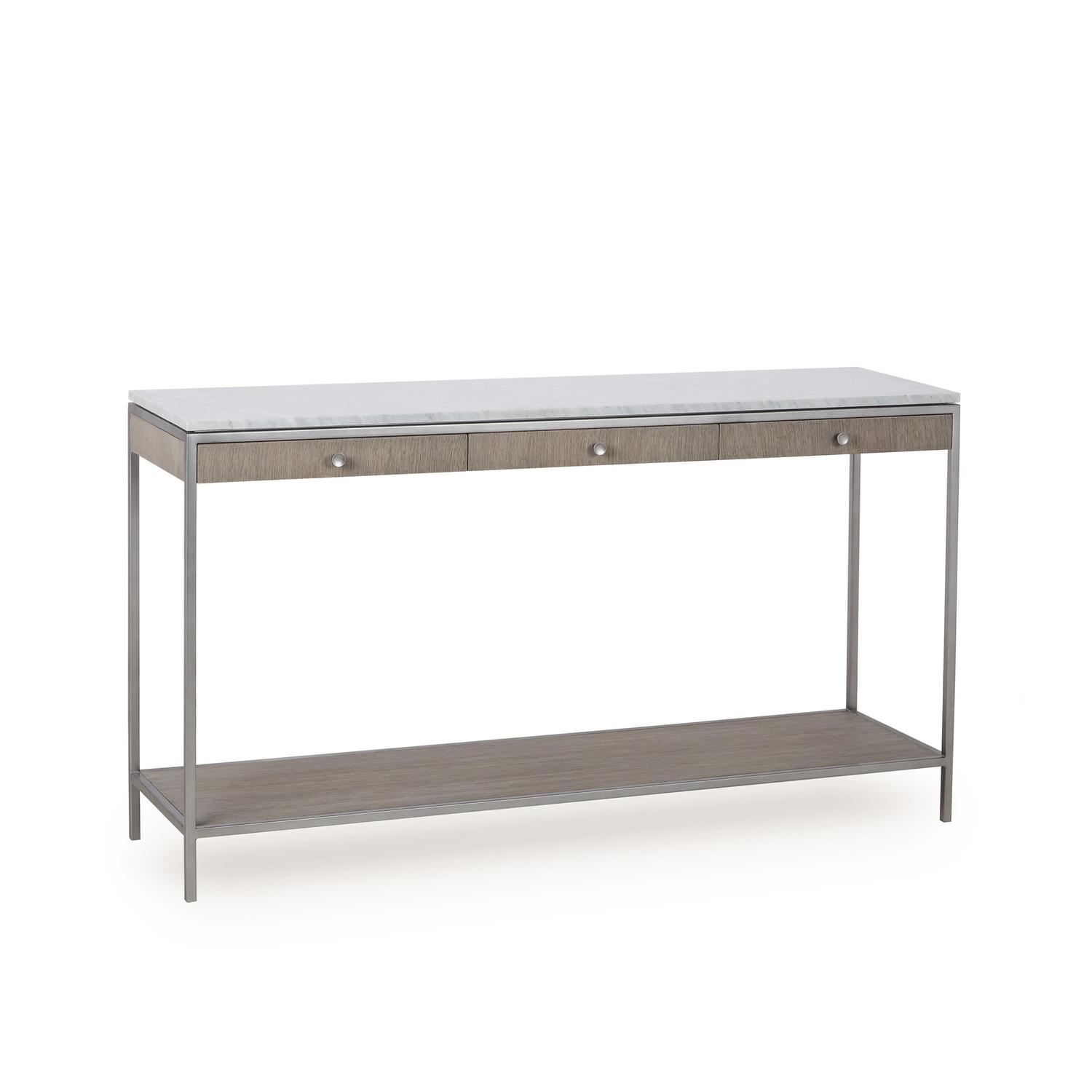 Convey effortless elegance with this two-tone console table crafted from a sleek steel frame finished in a brushed nickel, with open grain silver oak drawers and a polished white marble top. This piece will perfectly compliment a neutral room or stand out in a maximalist space. Rufus Console Table Light, Console Table - Andrew Martin