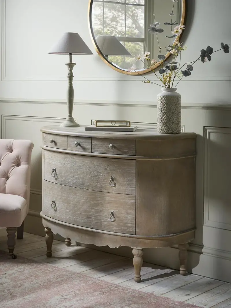 This wooden chest of drawers has an elegant, bow-fronted design with gracefully curved legs, and is crafted from pine finished with a subtle antique wash. The top features three petite drawers that curve gracefully, providing ample space for smaller items, while beneath, two spacious, deeper drawers offer ample storage for larger belongings, such as clothing and bedding. The drawer fronts are adorned with a combination of ornate drop handles and knobs, adding a touch of sophistication to the overall aesthetic.