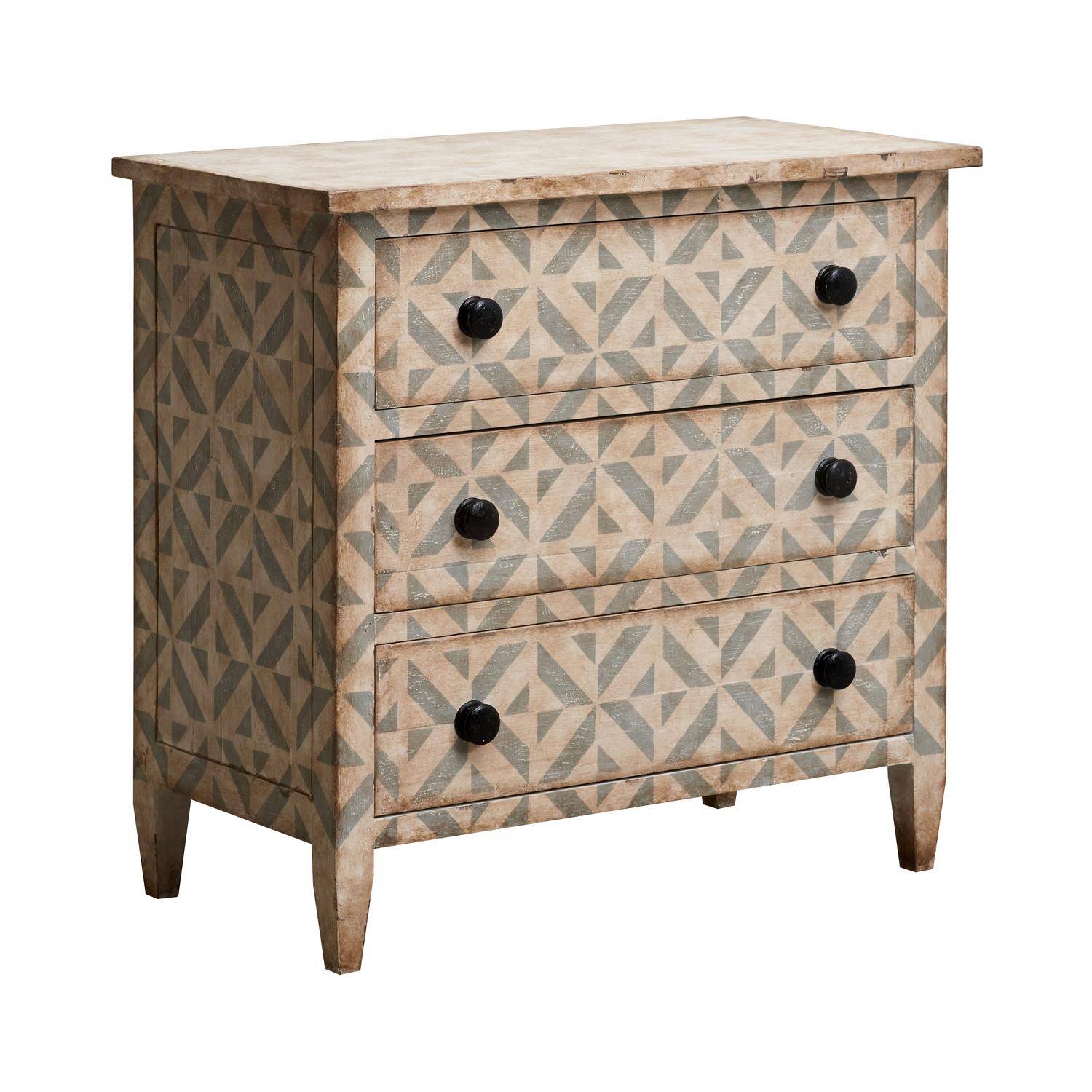 Hand-painted reclaimed wood chest of drawers in a clay-toned geometric finish. Sustainable, stylish, and lined with striped cotton fabric for a tailored touch. Sandro, Chest of Drawers - Andrew Martin