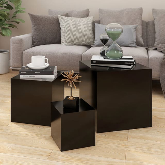 Sarki Wooden Set Of 3 Cube Side Tables In Black, This side table set is a timeless accessory for your home. They can be used as plant stands, telephone stand and sofa table etc. FEATURES : Material : Chipboard Finish : Black The side tables are made of quality board, making it durable and easy to clean This table set can be used in the living room to rest your drinks or any other necessities you need close at hand You can also bring one of them into your bedroom for use as a unique nightstand! Thanks to the difference in size, these end tables meet your multiple needs Manual assembly is required Available at an affordable price Images shown are for illustration purpose only LARGE TABLE DIMENSIONS : Height : 45cm Width : 45cm Depth : 45cm MEDIUM DIMENSIONS : Height : 35cm Width : 35cm Depth : 35cm SMALL DIMENSIONS : Height : 24cm Width : 24cm Depth : 24cm