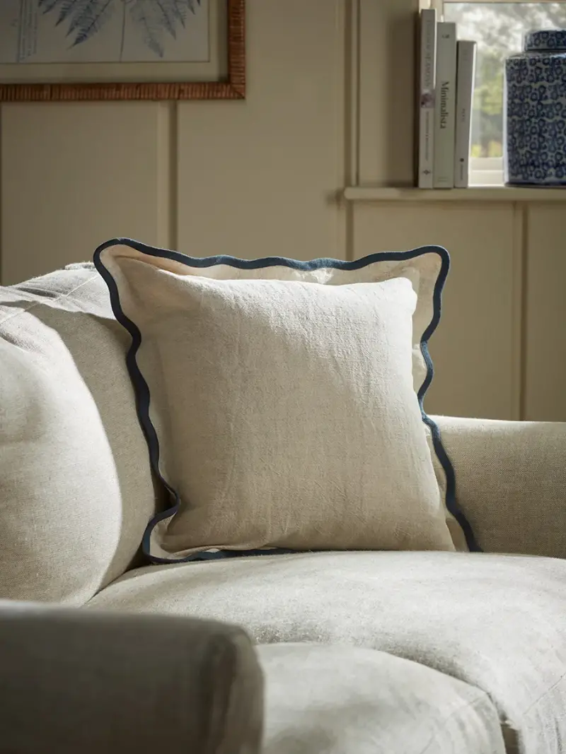 For an elegant and sweet finish to your home, place this cushion on your sofa, armchair or even bed. With a soft cover made from a linen and cotton blend, the neutral tones are contrasted with a blue piped scalloped edge, creating a homely atmosphere whenever it is placed. This cushion cover is suitable for a 45cm x 45cm cushion pad which is available separately.