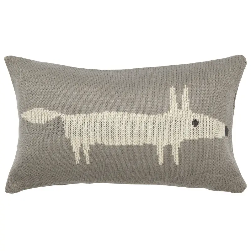 Silver Knitted Cushions Scion's signature Mr Fox motif is stunningly realised on this soft knitted bed cushion. The cushion features the mischievous Mr Fox on both sides in (what else) silver!
