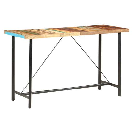 This cool wooden bar table has an industrial look and will make a distinctive addition to your dining room and kitchen. FEATURES : Material : Solid mango wood, steel Finish : Multicolour, Black The bar table is made of solid reclaimed wood, which means that it has the characteristics of different woods like teak, mango wood, acacia, etc. Reclaimed wood is solid, stable, durable and beautiful Signs of wear give each piece a unique look and the steel structure adds to its spectacular industrial style Every step of the construction process is carried out with the greatest care, be it recombining, polishing, painting or lacquering This bar table is easy to assemble The colour and wood grains may vary from piece to piece, making each piece unique and slightly different from the next; the delivery is random Available at an affordable price Images shown are for illustration purpose only DIMENSIONS : Height : 107cm Width : 180cm Depth : 70cm