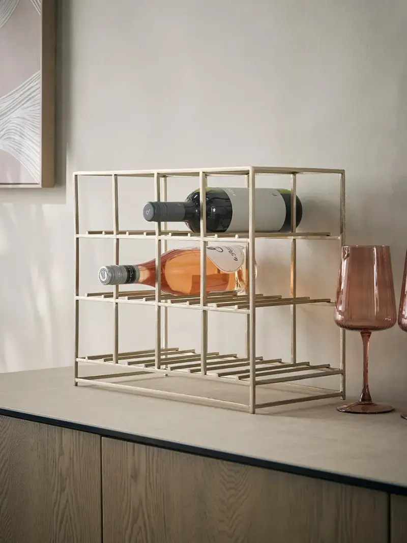 Made from iron and finished with a refined silver coating, this wine rack provides ample storage while maintaining a sleek and unobtrusive presence.Ideal for kitchens, dining areas, or dedicated wine spaces, this freestanding rack seamlessly combines industrial charm with classic elegance. Accommodating 12 bottles, it offers a practical and stylish solution for storing and displaying your favourite wines.