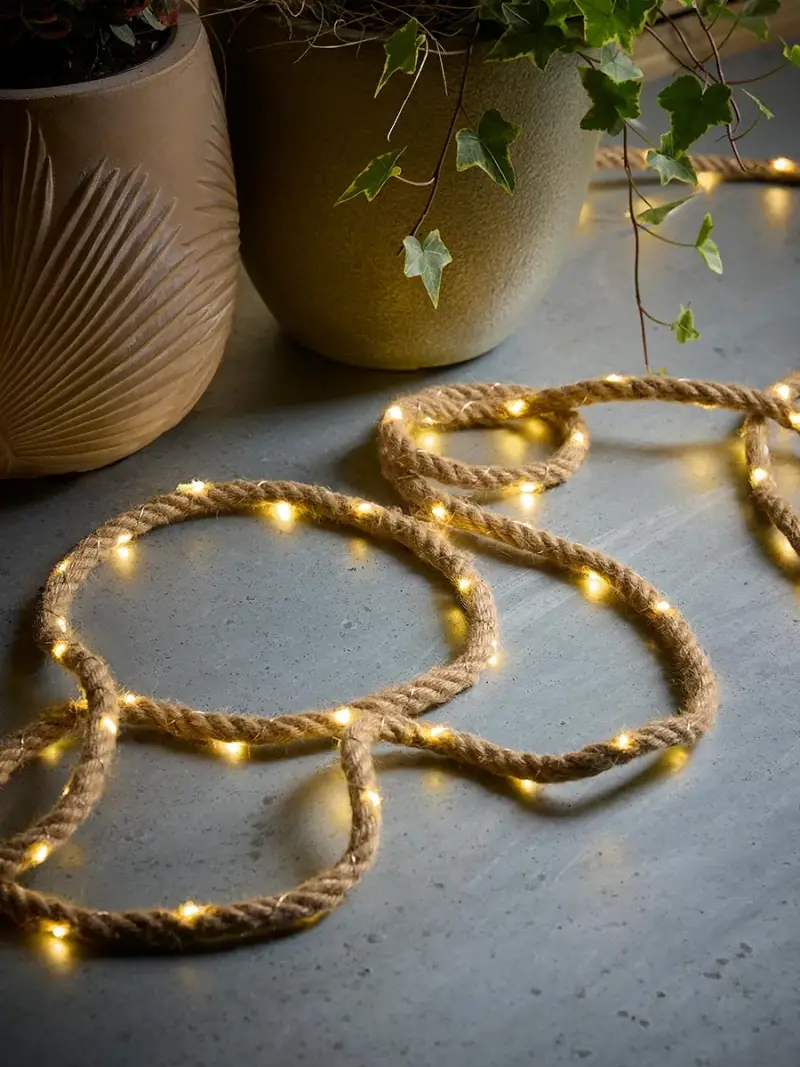 Bring magical atmosphere with a touch of rusticity to nights in the garden with this solar powered rope light.Featuring 100 warm white micro LED bulbs set into natural jute rope, it's perfect for wrapping around a trellis, pergola or through a tree.