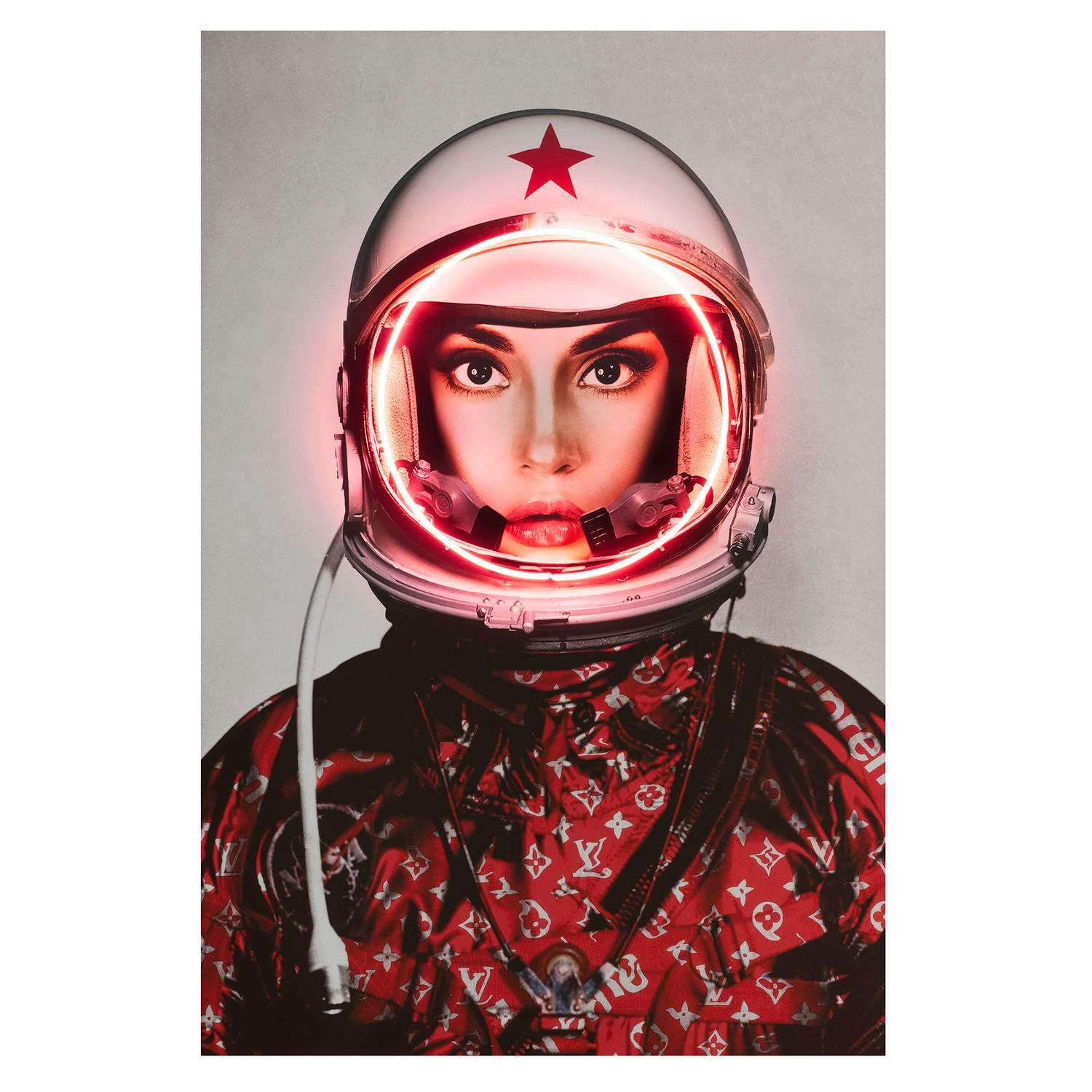 Neon artwork depicting an alluring galactic space girl in red, who's helmet lights up to draw focus to her gaze. Space Girl Logos, Red, Neon Artwork, Red, 122cm x 182cm - Andrew Martin