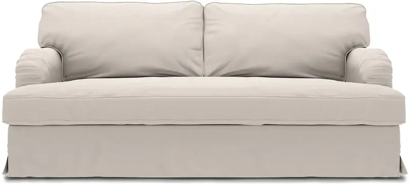 This style includes 4 pieces: 1 frame cover, 1 seat cushion cover / bench cushion cover and 2 backrest covers. It’s designed to only fit the IKEA Stocksund 3 seater sofa. This model features one cover enveloping the backrest, armrests and base frame. The cover is fastened in place along the backrest frame and armrests with velcro and a zip along the back of the sofa. The skirt features petite boxpleats at corners and is designed to skim the floor. Seat cushions are enclosed in a single, oversized seat cushion cover which is softly padded to avoid any creases between the inserts creating a luxe, custom look. Fitting instructions: Rremove the original covers along with the seat and backrest cushions. Drape the cover along the back and over the armrests. Gently pull the cover over the frame. The cover is designed for the perfect neat fit, so adjust both sides of the backrest and armrests simultaneously making sure that the seams are aligned. The base frame cover is secured with velcro along the backrest and armrests. Make sure the seams are aligned along the base frame and that the boxpleat hits the corner of the frame covering the legs. The skirt is designed to skim the floor. When the base frame cover is in place, close the zip on the back of the sofa. Place both seat cushions inside the single bench cushion cover, zip and put in place. The padding is designed to prevent visible creases between the cushion inserts creating the illusion of one oversized seat cushion. Place the backrest cushions inside the backrest cushion cover, zip and put in place.