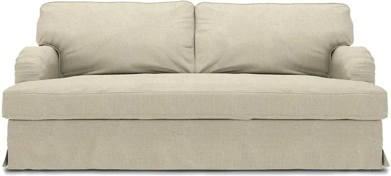 This style includes 4 pieces: 1 frame cover, 1 seat cushion cover / bench cushion cover and 2 backrest covers. It’s designed to only fit the IKEA Stocksund 3 seater sofa. This model features one cover enveloping the backrest, armrests and base frame. The cover is fastened in place along the backrest frame and armrests with velcro and a zip along the back of the sofa. The skirt features petite boxpleats at corners and is designed to skim the floor. Seat cushions are enclosed in a single, oversized seat cushion cover which is softly padded to avoid any creases between the inserts creating a luxe, custom look. Fitting instructions: Rremove the original covers along with the seat and backrest cushions. Drape the cover along the back and over the armrests. Gently pull the cover over the frame. The cover is designed for the perfect neat fit, so adjust both sides of the backrest and armrests simultaneously making sure that the seams are aligned. The base frame cover is secured with velcro along the backrest and armrests. Make sure the seams are aligned along the base frame and that the boxpleat hits the corner of the frame covering the legs. The skirt is designed to skim the floor. When the base frame cover is in place, close the zip on the back of the sofa. Place both seat cushions inside the single bench cushion cover, zip and put in place. The padding is designed to prevent visible creases between the cushion inserts creating the illusion of one oversized seat cushion. Place the backrest cushions inside the backrest cushion cover, zip and put in place.