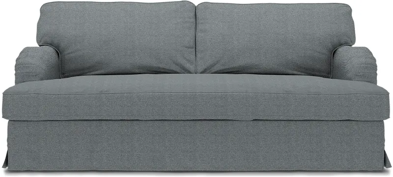 This style includes 4 pieces: 1 frame cover, 1 seat cushion cover / bench cushion cover and 2 backrest covers. It’s designed to only fit the IKEA Stocksund 3 seater sofa. This model features one cover enveloping the backrest, armrests and base frame. The cover is fastened in place along the backrest frame and armrests with velcro and a zip along the back of the sofa. The skirt features petite boxpleats at corners and is designed to skim the floor. Seat cushions are enclosed in a single, oversized seat cushion cover which is softly padded to avoid any creases between the inserts creating a luxe, custom look. Fitting instructions: Rremove the original covers along with the seat and backrest cushions. Drape the cover along the back and over the armrests. Gently pull the cover over the frame. The cover is designed for the perfect neat fit, so adjust both sides of the backrest and armrests simultaneously making sure that the seams are aligned. The base frame cover is secured with velcro along the backrest and armrests. Make sure the seams are aligned along the base frame and that the boxpleat hits the corner of the frame covering the legs. The skirt is designed to skim the floor. When the base frame cover is in place, close the zip on the back of the sofa. Place both seat cushions inside the single bench cushion cover, zip and put in place. The padding is designed to prevent visible creases between the cushion inserts creating the illusion of one oversized seat cushion. Place the backrest cushions inside the backrest cushion cover, zip and put in place.