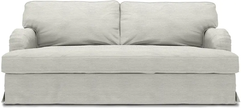This style includes 4 pieces: 1 frame cover, 1 seat cushion cover / bench cushion cover and 2 backrest covers. It’s designed to only fit the IKEA Stocksund 3 seater sofa. This model features one cover enveloping the backrest, armrests and base frame. The cover is fastened in place along the backrest frame and armrests with velcro and a zip along the back of the sofa. The skirt features petite boxpleats at corners and is designed to skim the floor. Seat cushions are enclosed in a single, oversized seat cushion cover which is softly padded to avoid any creases between the inserts creating a luxe, custom look. Fitting instructions: Rremove the original covers along with the seat and backrest cushions. Drape the cover along the back and over the armrests. Gently pull the cover over the frame. The cover is designed for the perfect neat fit, so adjust both sides of the backrest and armrests simultaneously making sure that the seams are aligned. The base frame cover is secured with velcro along the backrest and armrests. Make sure the seams are aligned along the base frame and that the boxpleat hits the corner of the frame covering the legs. The skirt is designed to skim the floor. When the base frame cover is in place, close the zip on the back of the sofa. Place both seat cushions inside the single bench cushion cover, zip and put in place. The padding is designed to prevent visible creases between the cushion inserts creating the illusion of one oversized seat cushion. Place the backrest cushions inside the backrest cushion cover, zip and put in place.