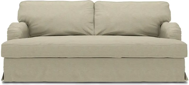 This style includes 4 pieces: 1 frame cover, 1 seat cushion cover / bench cushion cover and 2 backrest covers. It’s designed to only fit the IKEA Stocksund 3 seater sofa. This model features one cover enveloping the backrest, armrests and base frame. The cover is fastened in place along the backrest frame and armrests with velcro and a zip along the back of the sofa. The skirt features petite boxpleats at corners and is designed to skim the floor. Seat cushions are enclosed in a single, oversized seat cushion cover which is softly padded to avoid any creases between the inserts creating a luxe, custom look. Fitting instructions: Rremove the original covers along with the seat and backrest cushions. Drape the cover along the back and over the armrests. Gently pull the cover over the frame. The cover is designed for the perfect neat fit, so adjust both sides of the backrest and armrests simultaneously making sure that the seams are aligned. The base frame cover is secured with velcro along the backrest and armrests. Make sure the seams are aligned along the base frame and that the boxpleat hits the corner of the frame covering the legs. The skirt is designed to skim the floor. When the base frame cover is in place, close the zip on the back of the sofa. Place both seat cushions inside the single bench cushion cover, zip and put in place. The padding is designed to prevent visible creases between the cushion inserts creating the illusion of one oversized seat cushion. Place the backrest cushions inside the backrest cushion cover, zip and put in place.