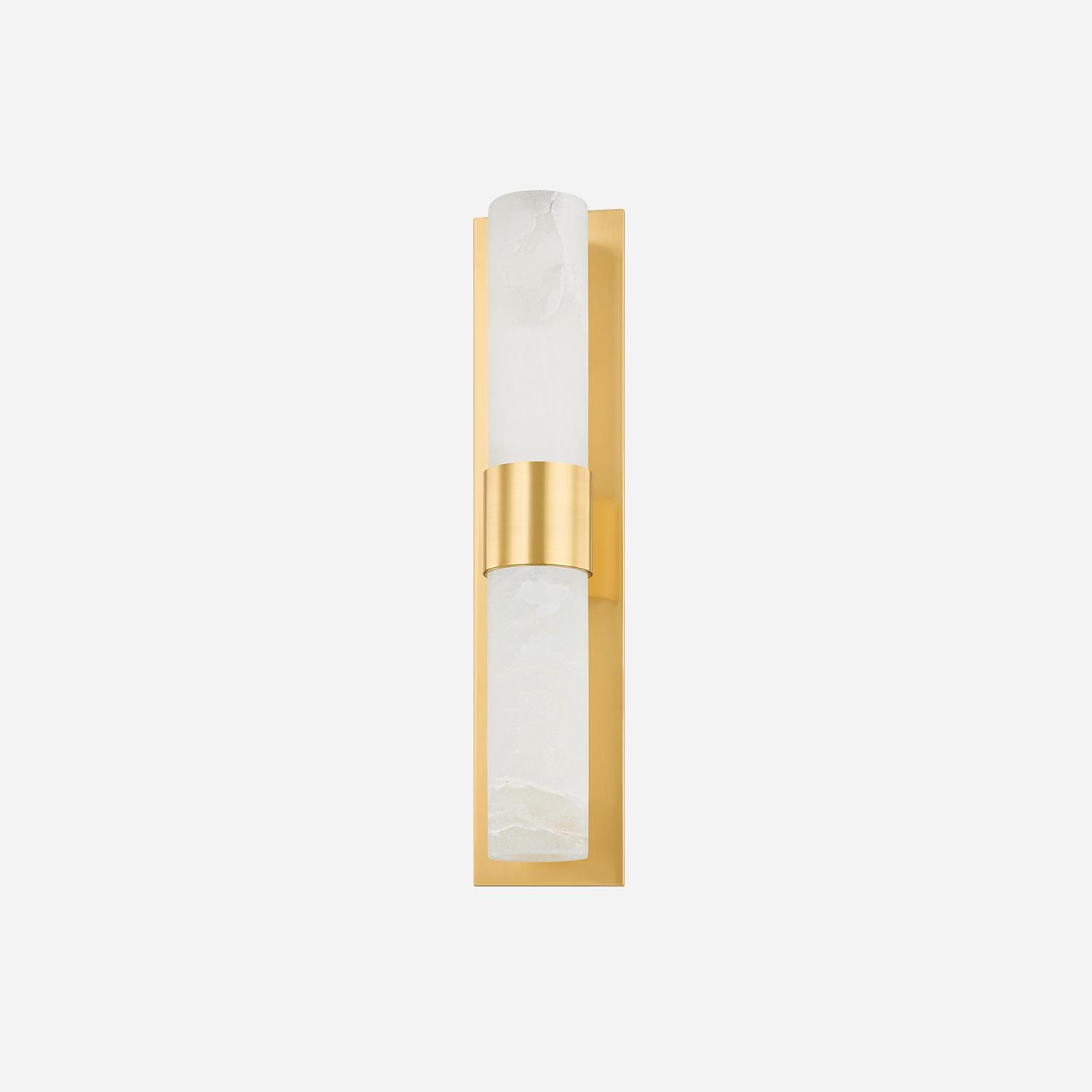 Discover the Stowe Wall Light in Aged Brass. A modern sculptural design featuring alabaster tubes and brass accents, perfect for any luxury space. Stowe, Light, Brass - Andrew Martin