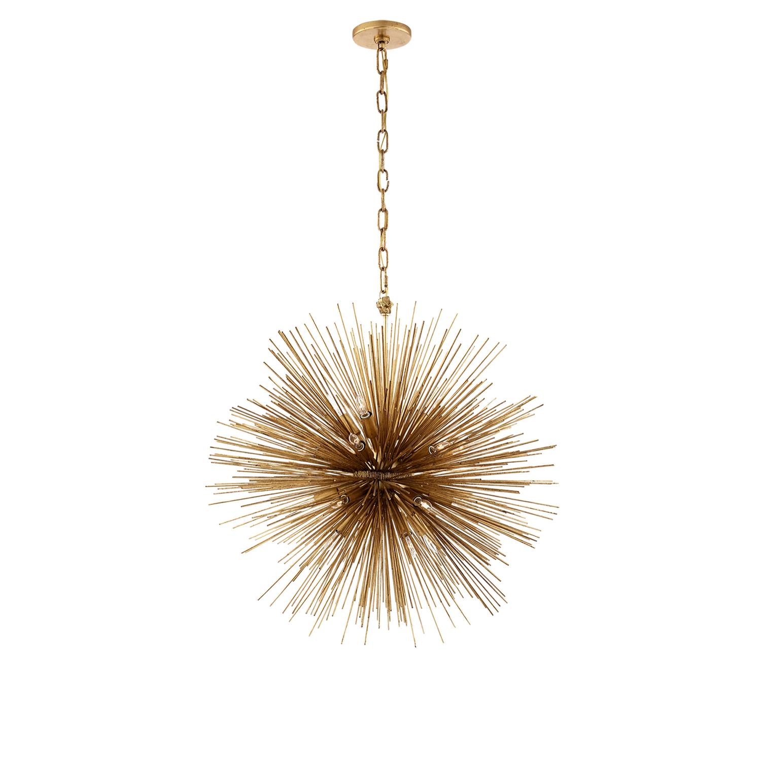 Luxury pendant light featuring 20 bulbs and extended spindles in gild. Crafted by iconic designer Kelly Wearstler, epitomising unique style and glamorous luxury. Strada Pendant Gild, Pendant Light, Medium - Andrew Martin