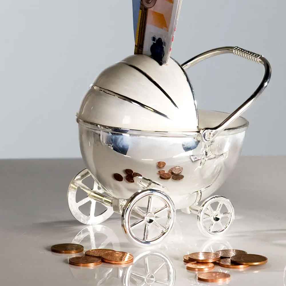 Stroller Money Box Lockable In Chrome With Cream And Silver