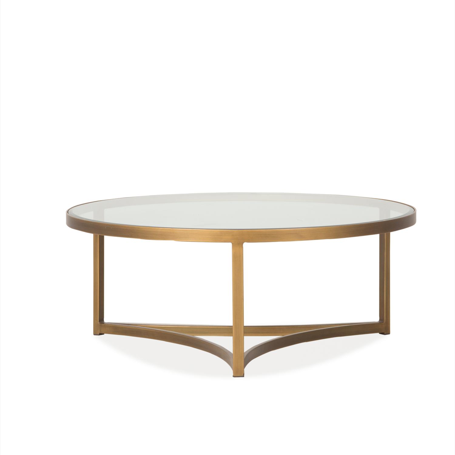 An elegant circular coffee table with curved three legged base, brass frame and clear glass inset top, available in medium or large size Sundance Coffee Table, Coffee Table, Medium - Andrew Martin