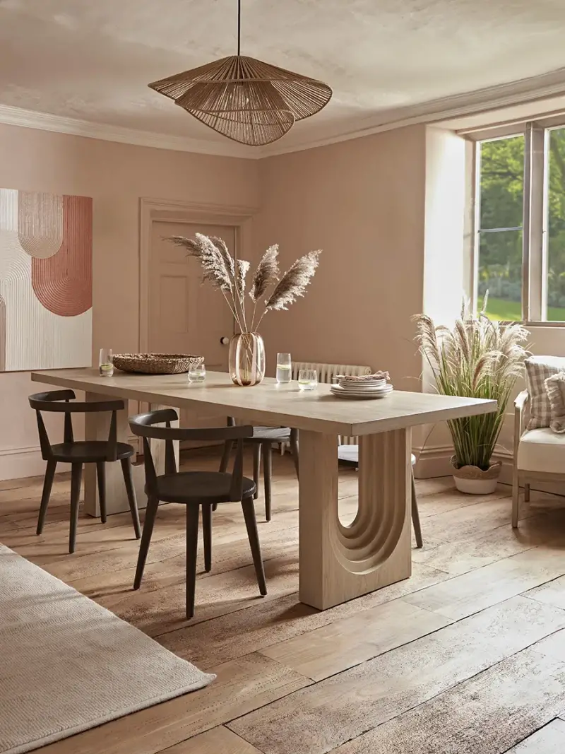 Enhance and brighten your dining space with this table crafted from a light blonde oak. A simple table top with clean and sleek lines work with chunky U-shaped legs that taper downwards in a step like style, for a retro and unique addition to your space. Explore the rest of our New Neutral collection and create a cohesive dining space.