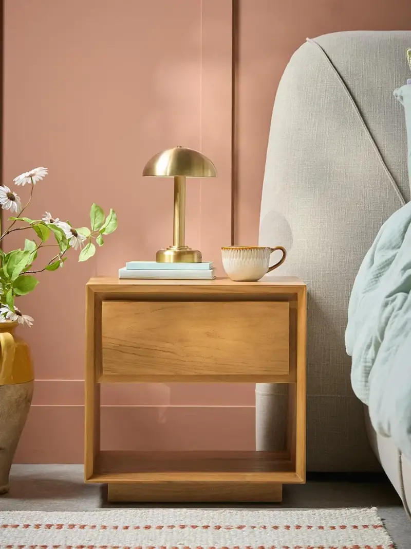 With a beautifully modern silhouette, this bedside table is crafted from a warming teak.With an open shelf to hold books, and a drawer to keep nighttime essentials tucked away neatly, this bedside table will slot easily into a variety of bedroom schemes.