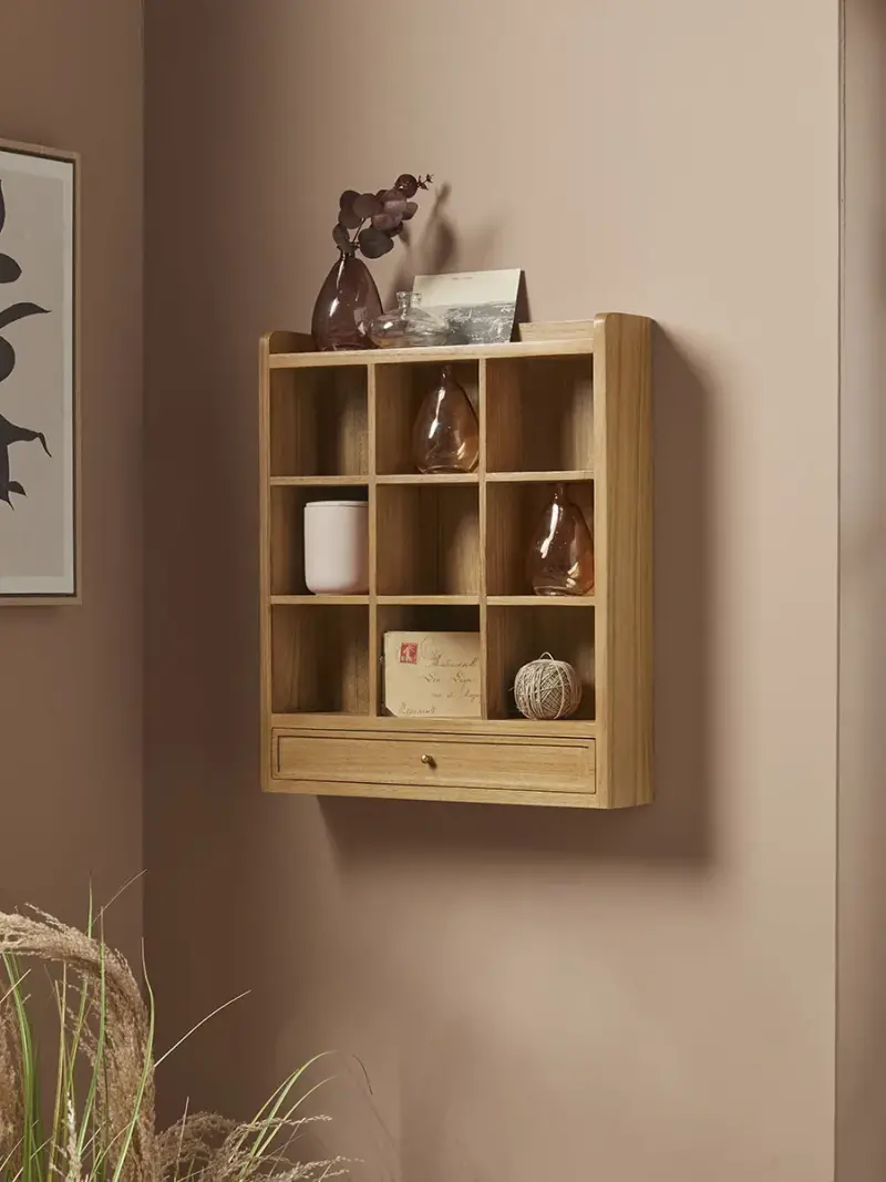 Crafted from a warming teak wood, this shelving cabinet has nine little cubby holes that hold and display your favourite mugs, pots or little vases beautifully.A slight raised ledge at the top creates a small shelf, and at the bottom a small drawer, ideal for keeping your home looking tidy. Finished with a small, round handle, working well with the simple lines, this cabinet works well in a variety of homes.