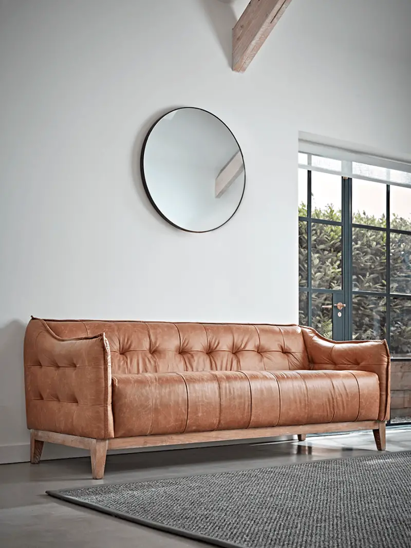 Our plush and ever so stylish sofa is a statement piece upholstered in a mellow brown vintage look leather, with a deep and decorative buttoned seat and low buttoned back. Perched atop four solid ash wood legs our Teddington Sofa has a seam detail to each arm rest which accentuates the wonderful curved feature. Our beautifully toned sofa with its relaxed form would sit well in a layered Industrial toned room to create a warmer, club house feel.